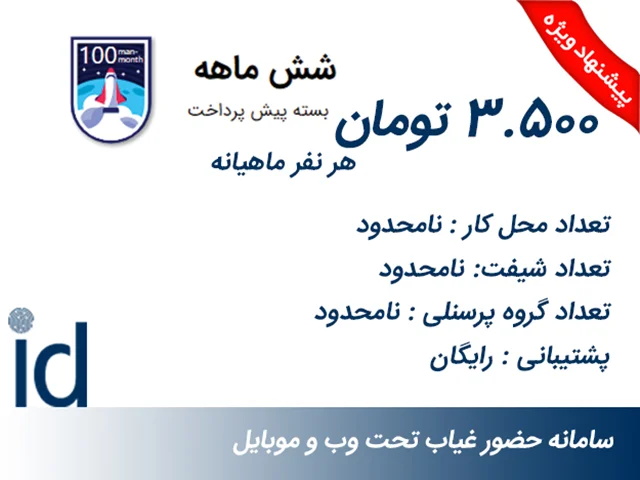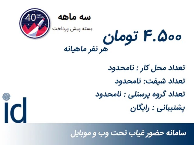 این سامانه برای شرکتهای متوسط، کوچک و اصناف از 2 تا 50 نفر طراحی شده است .این نرم افزار بصورت آنلاین در دو پلتفرم موبایل و وب طراحی شده است. پرسنل شما میتوانند با استفاده از اپلیکیشن موبایل در زمان ورود و خروج از محل کار تردد خود را ثبت و بدون نیاز به کاغذ بازی های رایج مجوز های مرخصی، تردد و ماموریت خود را از طریق موبایل و وب درخواست نمایند و با صرف کمترین وقت تنها در یک نگاه نسبت به وضعیت مجوز ها، تاییدات یا رد درخواستها آگاه گردند.